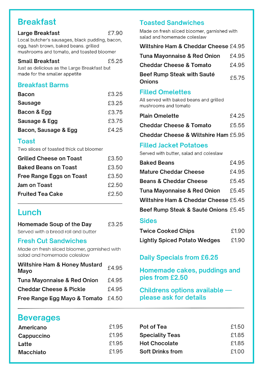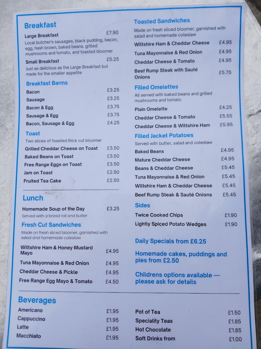 - Breakfast: Start your day with generous portions. Enjoy a Large Breakfast for £7.90 or opt for a Filled Omelette from just £4.25.